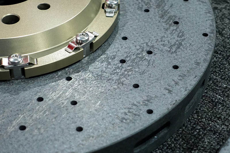 Carbon Ceramic е композитен материјал со двојна матрица, тродимензионален филц или плетенка од јаглеродни влакна како зајакнување на скелетот, и матрица составена од јаглерод (C) и силициум карбид (SiC). Така, материјалот е комбиниран со предностите на јаглерод и SiC, со висока цврстина, добра отпорност на топлина, висока цврстина, ниска отпорност на топлина. висока отпорност на триење и голема отпорност на оксидација. Во средина со висока температура, јаглеродната матрица може да обезбеди тампон и цврстина за топлината, за да се спречи пукањето на материјалот, може да повлече најмалку температура од 1650 ℃. Процесот на производство вклучува прво подготовка на C/C композитен материјал, а потоа воведување на фазата на SiC преку методи како што е импрегнација на течен силикон. На пример, C/C преформа прво се подготвува со користење на методи како што се хемиско таложење на пареа или карбонизација со импрегнација со смола. Потоа, преформата се доведува во контакт со течен силициум, каде силиконот реагира со јаглерод на висока температура за да генерира SiC, истовремено пополнувајќи ги порите во преформата. Поради одличните сеопфатни својства, јаглеродните керамички дискови широко се применуваат во напредни борбени авиони, шини со голема брзина, тркачки автомобили и спортски автомобили, итн.