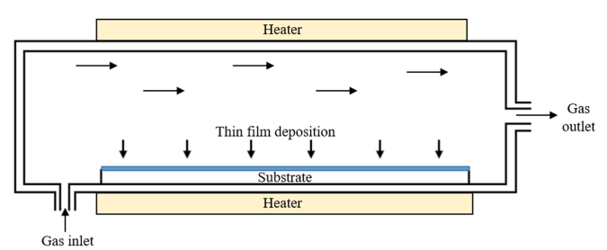 1. Прекурсорите на реакцијата се доставуваат во комората за реакција со помош на гас. Пред да стигнат до подлогата, реакционите гасови може да подлежат на хомогени реакции на гас-фаза во главниот проток на гас, создавајќи некои меѓупроизводи и кластери.