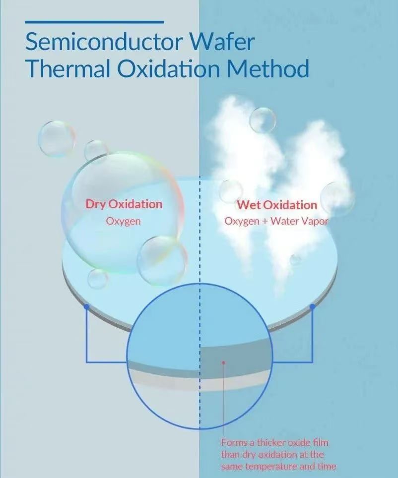 Влажната оксидација работи со изложување на силиконски наполитанки на водена пареа со висока температура, што предизвикува хемиска реакција помеѓу силициумот и пареата за да формира силициум диоксид (SiO2). Овој процес произведува оксидни слоеви со мала униформност и густина и произведува непожелни нуспроизводи како H2, кои обично не се користат во процесот на јадрото. Тоа е затоа што стапката на раст на оксидниот филм е побрза бидејќи реактивноста на водената пареа е поголема од онаа на чистиот кислород. Затоа, влажната оксидација обично не се користи во основните процеси на производството на полупроводници.
