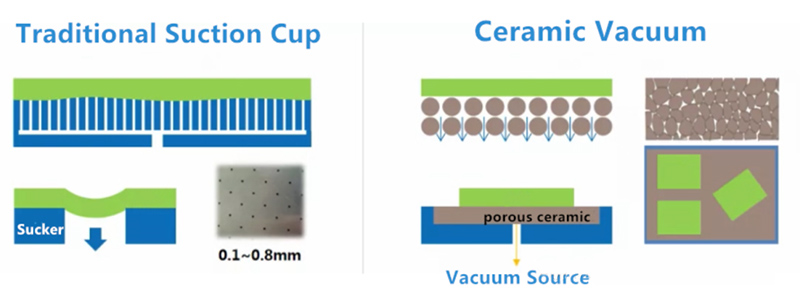 Традиционалните метални чаши имаат нерамномерна сила на вшмукување, се склони кон деформација на тенки материјали, немаат антистатички својства и се склони на абење и кинење поради нивната мала цврстина. Од друга страна, керамичките вакуумски чаки се погодни за тенки делови, нудат антистатички својства и се отпорни на абење и отпорни на корозија.