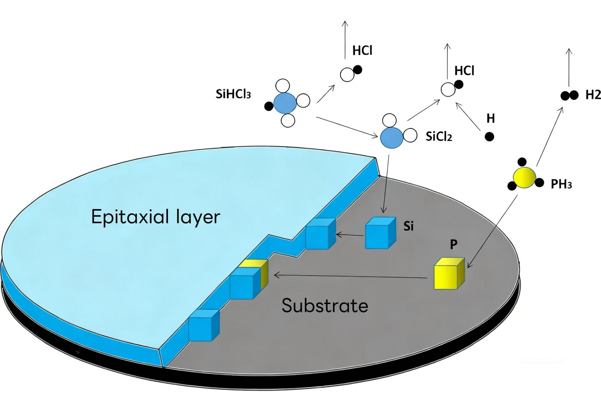 Силиконската епитаксија генерално користи епитаксична печка во фаза на пареа. Нејзиниот принцип е дека распаѓањето на изворот на силициум (како што се силин, дихлоросилан, трихлоросилан и силициум тетрахлорид реагира со водород за да се генерира силициум. За време на растот, допинг гасовите како PH3 и B2H6 може да се воведат истовремено. отпорност.
