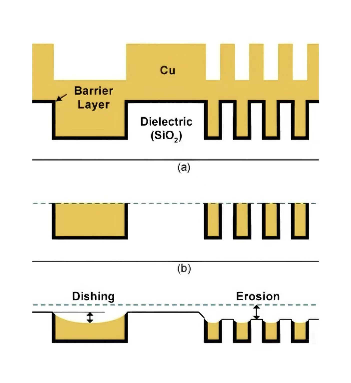 Хемиското механичко полирање (CMP), кое комбинира хемиска корозија и механичко полирање за да се отстранат површинските несовршености, е значаен полупроводнички процес за постигнување на севкупна планаризација нанафораповршина. CMP резултира со два површински дефекти, садови и ерозија, кои значително влијаат на плошноста и електричните перформанси на структурите за меѓусебно поврзување.