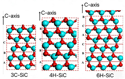 Се разбира, материјалот на SiC не е составен од еден тетраедар од еден атом Si и еден атом C, туку од безброј атоми Si и C. Голем број на Si и C атоми формираат повлажни двојни атомски слоеви (еден слој од атоми C и еден слој од атоми Si), а бројни двојни атомски слоеви се натрупуваат за да формираат SiC кристали. Поради периодични промени кои се случуваат за време на процесот на натрупување на двојните атомски слоеви Si-C, моментално има повеќе од 200 различни кристални структури со различни распореди. Во моментов, најчестите кристални форми во практична примена се 3C-SiC, 4H-SiC и 6H-SiC.