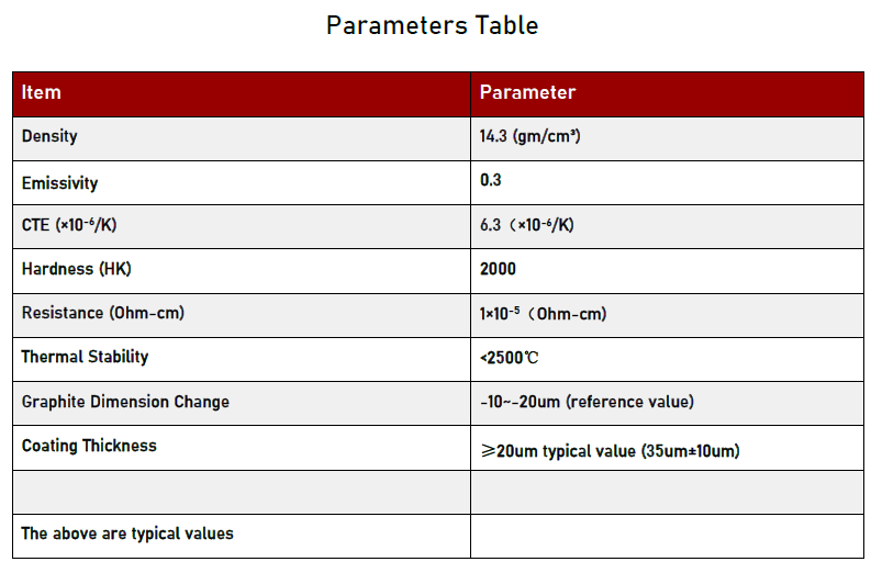 Тантал карбид е материјал со високи перформанси со исклучително висока точка на топење (приближно 3880℃), одлична топлинска спроводливост, супериорна хемиска стабилност и извонредна механичка сила. Специфичните параметри за изведба се како што следува: